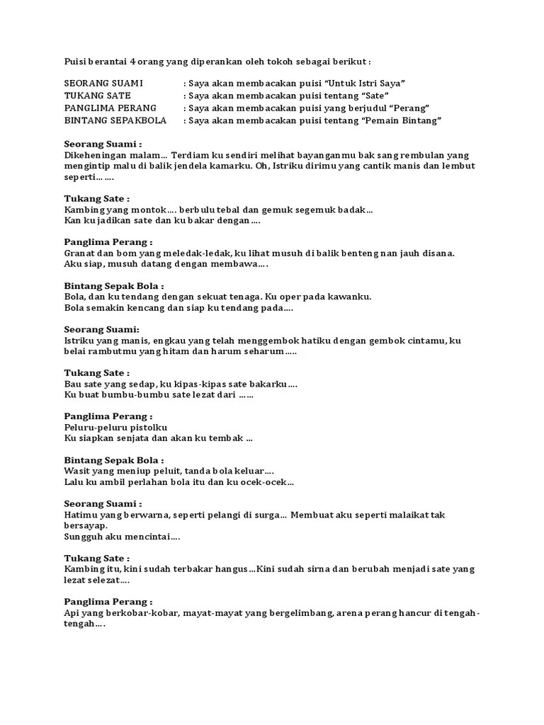 Duet 4 santriwati bacakan puisi bikn ngakak santriwati cantik ini berduet 4 orang bacakan puisi berantai yang bikin terhibur para jamaah . O :pujangga cinta al : Pada video pertama ini , kami berikan sebuah hiburan kecil berupa video lucu puisi berantai 4 orang yg di perankan oleh ustad, pereman, . Puisi berantai lucu 5 orang. Download puisi berantai untuk 4 orang mp3 for free, fast and easy ~ puisi berantai untuk 4 orang (10.71 mb) song and listen to puisi berantai untuk 4 orang .